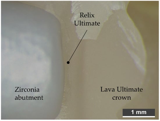 The second step cemented the Lava Ultimate crowns to the zirconia abutments. After brushing a thin coat of Scotchbond Universal adhesive (3M Espe) on both adhesive interfaces, without curing the layer, the nano ceramic resin crowns were cemented to the zirconia abutments using Relix Ultimate (3M Espe). During the cementation, pressure was maintained on the structure and the samples were light cured for 40 s (Valo Led-Ultradent). Excess cement resin was removed before photopolymerization by means of a micro-brush. Figure 5 shows the result of the procedure, in which the thin layer of Relix Ultimate material is visible between the crown and the zirconia abutment.