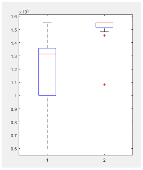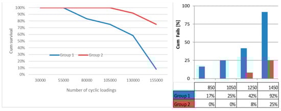 Descriptive statistics and the one-way ANOVA test (significance of 0.05) were used to determine the effect of the failure loads among the two groups (Figure 9). To test whether the fatigue response of the crown was significantly affected by the geometry of the two proposed abutments, one-way analysis of variance was performed for both groups on the number of survival samples at varying load values. The validity of the test was tested by Leven’s test, ensuring the assumption of homogeneity of variance (p-value 0.008).