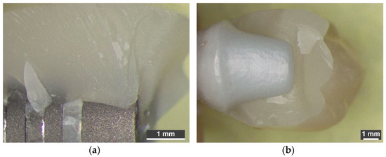 Moreover, it can be noted that the fracture mode differs between the two different groups: in group 1, all samples showed complete destruction of the crown with total debonding of the NCR material from the titanium abutment (Figure 8a). Conversely, all customized abutments’ and crowns’ fracturing was partial in all cases and did not affect the zirconia abutment (Figure 8b).