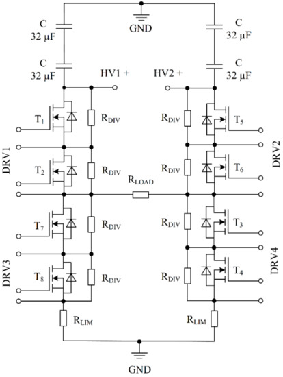 It can be seen that the circuit has 8 MOSFET switches T1–T8 (C2M0080120D, Cree Inc., Durham, NC, USA), with two switches in each wing. For pulse forming, 4 switches are driven in synchronization (i.e., T1–T4 or T5–T8), which enables a bipolar pulse shape. However, the dynamic characteristics of a MOSFET are load-dependent, therefore, a synchronized double-crowbar driving circuit is introduced. It implies that after each pulse, an additional wing is opened to shunt the circuit (e.g., when T1–T4 are going to be closed to end the pulse, the T7, T8 are opened at the same time). Therefore, a second route for the current is formed, which is limited only by RLIM = 10 Ω, thus a minimum fall time of the pulse is ensured. The capability to form MHz range and sub-microsecond pulses is the most important factor to ensure the novelty of the electroporator, therefore, it is counter-productive to use lots of series switches due to the respective increases in the rise and fall times. However, the use of series switches is required to increase the handling voltage. As a result, the circuit had to be designed to feature minimum parasitic inductance and still have a reserve in terms of breakdown voltage to account for reverse voltage during maximum loads (~40 A). The breakdown voltage of a single switch is 1.2 kV, thus when switches are used in an array of 4, the total breakdown voltage is 4.8 kV. However, during pulse forming (a stage is opened), for the whole duration of the pulse, the charging voltage is distributed only between two switches (either the pair of T7, T8 or T3, T4).