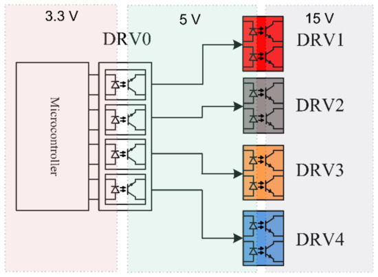 A fast galvanically decoupled driving circuit had to be introduced to enable MHz switching with sub-100 ns pulses. Therefore, we introduced a 3-stage, 8-channel driver including a microcontroller, the main driver (DRV0), and the respective drivers for MOSFETs (DRV1-4). The simplified block scheme is shown in Figure 2.