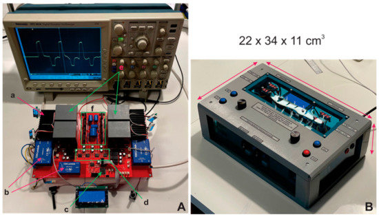 It can be seen that the prototype features a compact design (22 × 34 × 11 cm3). The user interface involves a 4 × 16 LCD display showing basic pulsing parameters, two potentiometers (control of charging voltage), and 4 buttons (Figure 3B).