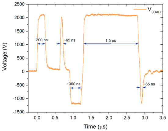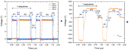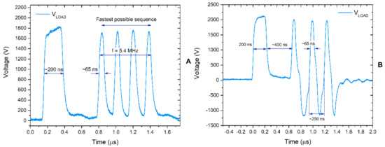 As can be seen in Figure 4A, firstly, the DRV1 and DRV4 are triggered to form a 200 ns pulse by opening the respective switches (T1–T4, refer to Figure 1). Then, a crowbar (C1) is used to rapidly cut the fall time (DRV3 is triggered, which opens T7 and T8), followed by a 500 ns pulse of reverse polarity (DRV2 and DRV3 are active to control T7 and T8). Similarly, in order to cut the fall time, the second crowbar is used (C2) and, thus, DRV4 is triggered (T3 and T4 are open). The effects of such a driving sequence can be observed in Figure 4B. It allows rapid switching of kV range pulses even in kΩ loads. A programmable delay D1 can be introduced between repetitive sequences.