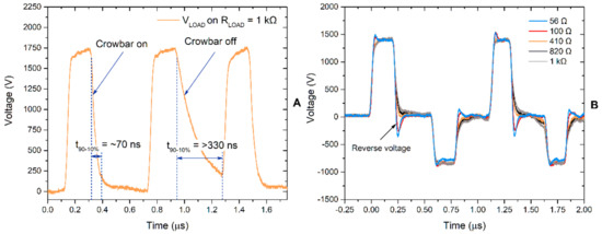 The importance of the crowbar circuit can be highlighted when the prototype is tested with various loads. The effects of the crowbar circuits and pulse waveform dependence on the RLOAD are presented in Figure 5.