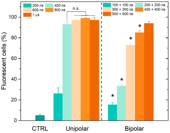 Cell permeabilization triggered by single unipolar and bipolar pulses of 20 kV/cm, where the asterisk (*) corresponds to statistically significant (p < 0.05) differences between unipolar and bipolar pulses of identical energy; n.s.—statistically non-significant (p > 0.05).