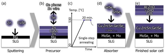 Sample preparation steps: (a) Sputtering of Zn and Cu-Sn, (b) precursor stack annealed under Se atmosphere with Sn wire and Ge pieces, (c) performed temperature profile, (d) (simplified) reaction scheme, and (e) the solar-cell finishing steps.