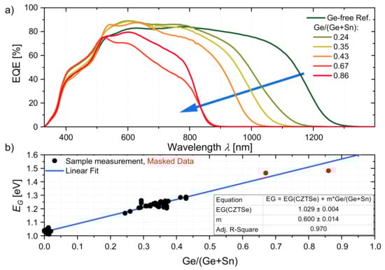 We find a clear shift in the absorber band gap towards higher energies with increasing Ge content, showing the expected linear behavior for the samples with Ge/(Ge + Sn) < 0.67. The slope of this relation amounts to (0.600 ± 0.014) eV per Ge/(Ge + Sn), which is close to the value of 0.52 reported in the literature for other growth techniques [1,2]. For higher Ge contents, i.e., ≥ 0.67, further increased Ge content in the layer does not lead to the expected band gap rise, indicating that the incorporation of Ge into the kesterite crystal may have reached a saturation point, above which the further addition of Ge may rather lead to condensation, secondary phases, or crystal defects. In this region, major losses, which are predominant in the high wavelength part of the presented EQE spectra, are visible, indicating the presence of transport issues, increased recombination, and reduced collection lengths [2].