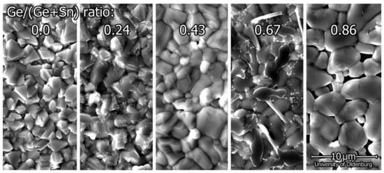 The morphology of the samples was influenced by the added Ge content as shown in Figure 3. The morphology of the reference sample shows sharp grains with sizes of approximately 2 μm. Samples with added Ge show a clear trend towards larger grains and less sharp edges. The most extreme sample with Ge/(Ge + Sn) = 0.86 shows grain sizes of approximately 5–6 μm. With increased grain size the density of the grain boundaries decreases, which could influence the recombination behavior. Overall, the possible effects of grain size are assumed to be overlapped by other effects (e.g., secondary phases, strain, etc.); therefore, within this study no conclusions were drawn about the possible influence of grain size on the device performance.