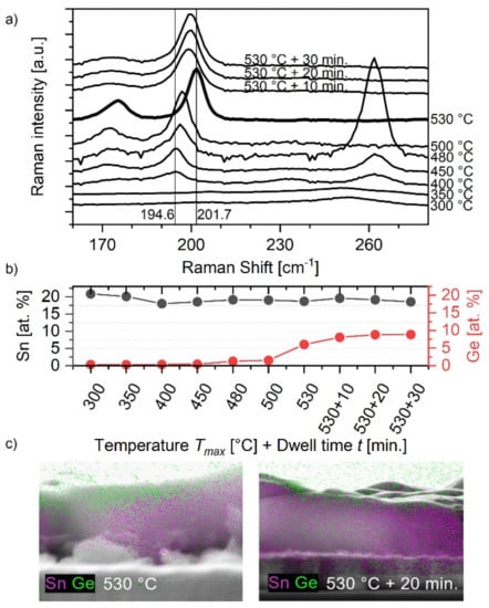 (a) Raman spectra and (b) atomic percentages of Sn and Ge for the samples prepared from interrupted-annealing experiments, quenched at temperatures of 300 °C, 350 °C, 400 °C, 450 °C, 480 °C, 500 °C, 530 °C and for samples with Tmax of 530 °C including a dwelling step of 10 min, 20 min and 30 min duration. (c) The cross-section EDX mappings show the distribution of Sn and Ge for samples without and with a dwelling step.