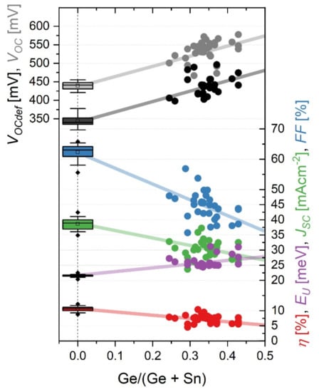 To measure the PV device characteristics, all the samples were coated with CdS and TCO layers to fabricate the solar cells. A summary of IV parameters and EQE analysis for samples with Ge/(Ge + Sn) ≤ 0.43 is given in Figure 5.