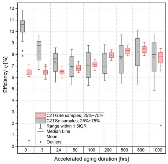 The fill factor FF of all CZTGSe devices was found to be lower than the reference CZTSe. A possible reason for this could be the non-adapted solar-cell-device-processing steps. These were only optimized for the Ge-free kesterite and simplified for a facile procedure that contains no treatments besides the main steps (i.e., no air annealing, no etching, etc.). In the case of Ge-containing kesterite, additional steps such as etching or pre-treatment for the buffer-layer deposition might be necessary to improve the CdS homogeneity and quality of the interface in order to overcome the loss in the observed fill factors. The noticeable scattering of the data shown in Figure 5 is due to process variations over a longer time range (months), different substrate batches and different CdS deposition batches. The overall PCE η for CZTGSe cells is lower than the Ge-free-CZTSe reference, yet still shows one of the highest reported efficiencies of 10.4%, with a Ge/(Ge + Sn) ratio of 0.32 (EG = 1.22 eV). The IV curves of the corresponding sample are shown in Figure S6. IV curves for the five different Ge ranges introduced in the context of Figure 3 are compared in Figure S7. In addition to the IV and EQE measurements of freshly fabricated devices, a time-stability analysis was performed using an accelerated-aging procedure. A total of 12 CZTSe solar cells and 12 CZTGSe solar cells with Ge/(Ge + Sn) ≈ 0.30 ± 0.02 were kept in a controlled climate chamber at 85 °C for a total duration of 1000 h. Since the devices were not encapsulated, the relative humidity RH was maintained at 20% [31]. To rule out the mechanical stress by repeated sample measurements and to obtain more reliable data on the influence of handling, the best, the worst and one intermediate cell per sample was only measured initially and after the completion of the entire aging duration of 1000 h. These were found not to differ from the presented values and are also included in the corresponding boxplots at 0 h and 1000 h. The evolution of the sample efficiencies is summarized in Figure 6.