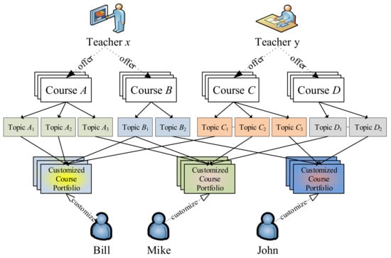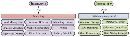 To further explain the motivation of our work, we depict the concepts in Figure 1, Figure 2, Figure 3 and Figure 4 to illustrate the drawbacks pointed out in Section 1. In Figure 1, instructors respectively offer their professional courses based on their subjective arrangements. Based on the traditional learning model in Figure 2, learners can only select the course packages organized by a single instructor with no flexibilities at all. To mitigate this shortcoming, we propose to divide a course into units (or topics) of high cohesion and coherence, and learners can customize their own course portfolios from different units offered by different instructors as shown in Figure 3.