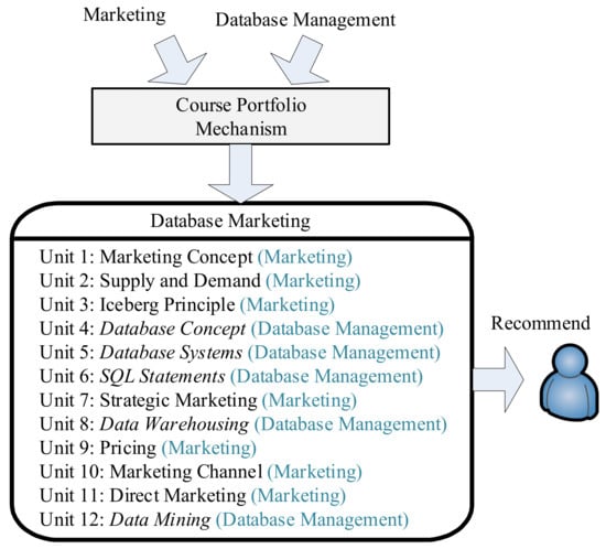 For example, suppose there are two instructors, and one offers a course in marketing and the other offers a course regarding database management. When a student S wants to learn how to apply database management technologies to his own business marketing applications, S has to join both courses to acquire the needed knowledge. If S does not have much time to learn both courses, then S may need to pay many times trying or searching for other acceptable alternatives to fulfill his demand. However, with the help of our approach with E-learning 2.0, S may proactively choose some of the topics in marketing and some of the topics in database management to customize his own course portfolio (it may be called Database Marketing) through the course portfolio mechanism as illustrated in Figure 4.