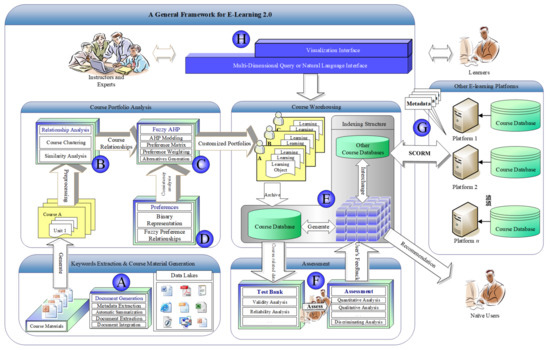 - Course Warehousing: To inspire an open e-learning system and offer hooks for integration with other systems, this module recommends using a multi-dimensional course warehousing structure to index the result obtained in the previous modules (node E). Based on such a flexible structure, the course content can be organized into hierarchies and pivoted for visualization from different perspectives. The course warehouse is only a multi-dimensional index pointing to the corresponding SCORM standard for further integration with other courses (node G).