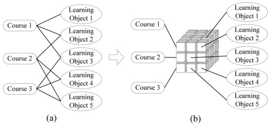 Organizing learning objects into a multi-dimensional topic cube. (a) The mapping between courses and learning objects are one-dimensional; however, (b) The mapping can be organized into a multi-dimensional structure.