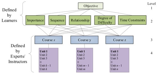 Since the purpose of the final decision is to generate an intermixed course unit combination for a learner, namely S, the outer stage criteria should be set by S. However, as the unit relationships within a course should be determined by instructors (or experts), we design the decision model as a structure of two-stage AHP model as shown in Figure 8. That is, the outer stage concerns the learner side, and the inner stage corresponds to the instructors’ side. The top two levels are defined by the learner, and the bottom two levels are defined by the instructors. We explain both stages bottom-up as follows: