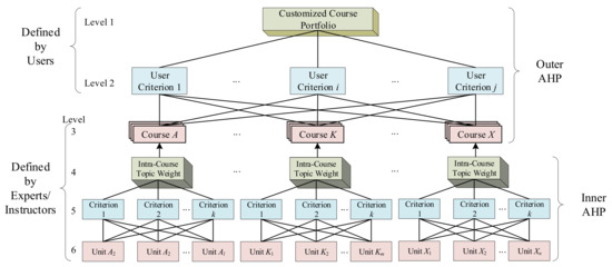 Both stages of our AHP model can be generalized by propagating the result of inner AHP, which is conducted by an instructor-decided AHP, to the outer stage, evaluated by the learner-decided AHP, as illustrated by Figure 9. Each learner can select some predefined criteria (e.g., the importance, sequence, relationship, degree of difficulty, and time constraints) on the objective level, i.e., Level 2, using the available courses selected in Level 3, based on the derived intra-course weights in Level 4, which are in turn calculated from the criteria defined by instructors in Level 5, and applied to the units placed on Level 6.