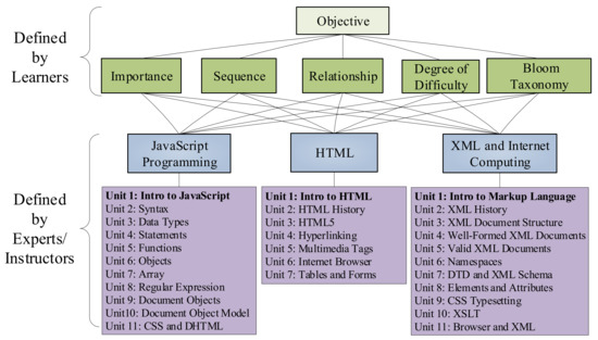 The knowledge design for a specific course could be mapped into a set of learning objects according to the famous Bloom’s Taxonomy [23] or its revised counterparts [24,25] as depicted in Figure 6. In Bloom’s Taxonomy, the knowledge dimension organizes domain knowledge into a hierarchy, which teaches users to learn about what, how, and then why, and the cognitive process dimension can be used as a guideline for designing the pedagogy for a specific course.