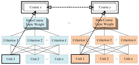 In the evaluation process, each course can be regarded as a decision structure in the inner stage and is computed to derive the intra-course unit weights based on the instructor’s criteria. Then, after all, selected courses are determined, the outer AHP is appraised to generate the customized course portfolio based on the learner’s criteria settings. As such a process is tedious to explain, we use the simplest structure in Figure 8 to illustrate the concept.