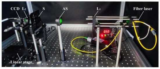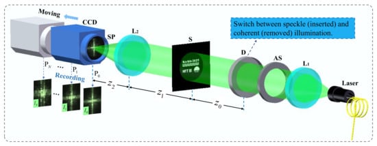 The experimental verification is made by using the experimental device shown in Figure 8. A fiber laser (532 nm) is collimated by a lens (f = 200 mm). A diffuser (DG10-120-MD, Thorlabs, 120 grit) serves as a scattering medium. The focal length of lens  is 35 mm. A CCD (3.1 m) is moved by a precision linear stage.