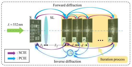 where  () is intensity images recorded from coherent illumination. The purple and blue arrows represent the iterative process of SCIE and PCIE respectively in Figure 3.