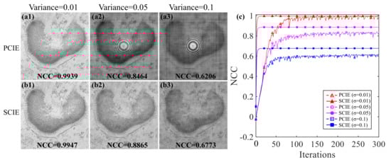 The robustness comparison of PCIE and SCIE is proved in Figure 5 []. A zero-mean Gaussian noise is added in all coherent patterns, and the variance of the noise is set as 0.01, 0.05, and 0.1, respectively. Figure 5a1–a3,b1–b3 show the reconstructed results under the noise of different variances by using PCIE and SCIE, respectively, after 1000 iterations. The reconstructed quality of SCIE is visually better than that of the PCIE with the same noise. The corresponding convergence curves are shown in Figure 5c. As the noise level increases, the reconstructed quality decreases for these two methods. NCC values of SCIE are always better than that of PCIE for different noise levels.