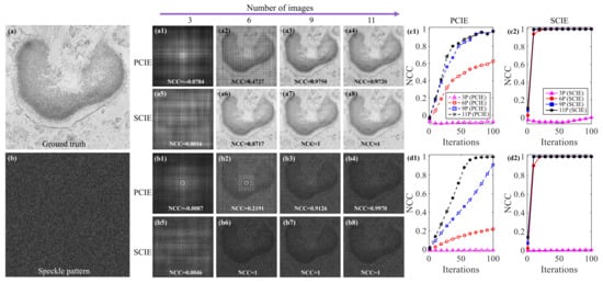 PCIE and SCIE are verified in the single-lens CDI system. The numerical simulations of convergence speed and robustness are presented in Figure 4, Figure 5 and Figure 6. The reconstructed images from PCIE and SCIE are shown in Figure 4a1–a4,b1–b4. The reconstructed result of SCIE is distinguishable and normalized correlation coefficient (NCC) reaches 1 after 100 iterations, whereas the result of PCIE is heavily degraded with the same iterations. SCIE performs well in the convergence speed compared to PCIE.