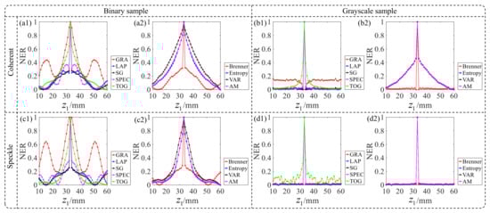 When only the object distance,  in Figure 1, is unknown. The positive effect of the diffuser on estimating the distance value will be checked in the simulation. The search boundary of  is 10 mm∼60 mm. To compare the results of CEFs in both coherent and speckle illumination, all evaluation results are normalized. The CEF curves are shown in Figure 7. Binary sample and grayscale sample used here correspond to Figure 4 and Figure 6a, respectively. The curves in Figure 7a1,a2,b1,b2 denote the results with the coherent illumination and the curves in the Figure 7c1,c2,d1,d2 are for the speckle illumination. For the binary sample, it is obvious that the speckle illumination is helpful for a stable and robust searching focus for all CEFs except GRA. The original correct result of GRA under coherent illumination is destroyed. The sensitivity of the curves is significantly improved. For the grayscale sample, the autofocus curves of the two illumination modes show good unimodality and high sensitivity, except for TOG. The curve performance of GRA, Entropy, and AM has been improved. However, the originally good TOG curve was destroyed. In summary, a diffuser is more conducive to accurately estimating the diffraction distance by CEFs. Speckle illumination is helpful for a unique and robust auto-focusing search even using the simple metric function in the single-lens CDI system.