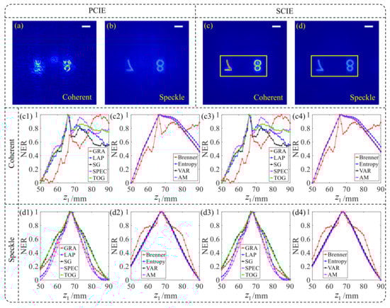 The reconstructed results and normalized CEF curves. (a–d) are the reconstructed results; (c1–c4) are the CEF curves for diffraction patterns; (d1–d4) are the CEF curves for speckle patterns. NER: normalized evaluation result. The white bar corresponds to 620 m.