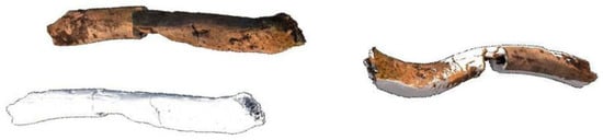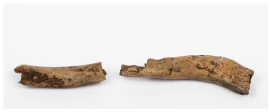 This right clavicle is more preserved than the other bones mentioned above, which cannot be studied at present. It consists of two pieces, numbered 56-186-007-AG-22-122 and 56-186-007-AG-23-173 (Figure 3), discovered separately at a one meter distance from each other. The two pieces match, so they can be assembled in a single fragment of approximately 7 cm. The bone fracture followed the taphonomic processes and no human fracture on fresh bone is evidenced. The acromial and sternal extremities are missing and it may be noted a bone loss at the middle level of the diaphysis. The cortical bone is altered. The absence of epiphyses makes it impossible to determine the subject’s age at death. However, in view of the general morphology of the bone, we propose to classify it in the adult age group. Although the graceful appearance of the bone morphology could point to a female gender, the clavicle is also not a sufficiently diagnostic element for the determination of sex [64]. Indeed some studies try to determine sex from anthropometric dimensions of the clavicle, but this is on a targeted population [65,66], and we would have gone further on this question only if we had been able to have other analysable bones.