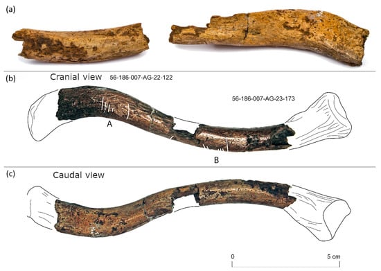 Photos of the pieces (a), cranial with highlighted cut marks belonging to A/B groups (b) and caudal (c) view of the clavicle fragments.