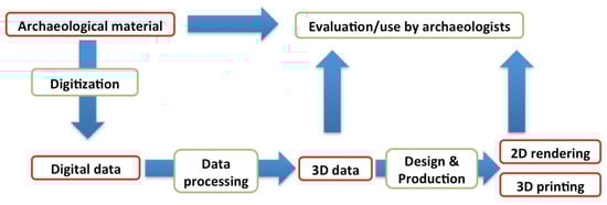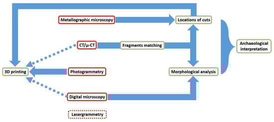 3D printing has served as a support for annotations for tracking the study of traces. This use of 3D printing is little explored at the moment, but the routine use of this technology makes it possible to produce easily and inexpensively copies of objects and to use them as a support for sketches, annotations of work under study, such as a draft sheet, with the advantage of a physical 3D representation very easily understandable. These 3D prints are already used to constitute reference collections for education [80,81] or for particular collections like pathological or paleoanthropological bones [82]. Figure 14 attempts to summarise the contribution of each technique and their combination in relation to the different objectives expressed above.