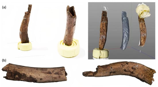 For the photogrammetry of the clavicle, 121 photos for fragment 56-186-007-AG-22-122 and 94 for fragment 56-186-007-AG-23-173 were taken in July 2015, using a camera Canon EOS 7D EF100 mm f/2.8 L. The photos have a resolution of 3456 × 5184 pixels and have been taken indoors with flash and flash reflector umbrellas. The two bones have been planted head up and head down in Blu Tack adhesive, to get the best possible coverage. The photogrammetry of the clavicle was performed using Agisoft Metashape software (Figure 5) with the characteristics presented in the Table 1. “Cameras aligned” is the number of cameras for which the software was able to find position and orientation. “Tie points” is the number of points in a digital image that represent the same location in an adjacent image. “Dense cloud points” is the number of points in the dense cloud, calculated from the estimated camera positions, and for which program estimates depth information. “3D model faces” is the number of polygons in the mesh reconstructed from the dense cloud.