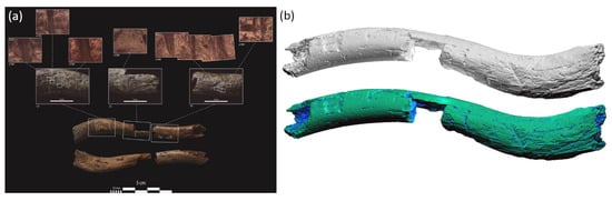 - Bello, S.M.; Galway-Witham, J. Bone taphonomy inside and out: Application of 3-dimensional microscopy, scanning electron microscopy and micro-computed tomography to the study of humanly modified faunal assemblages. Quat. Int. 2019, 517, 16–32. [Google Scholar] [CrossRef]