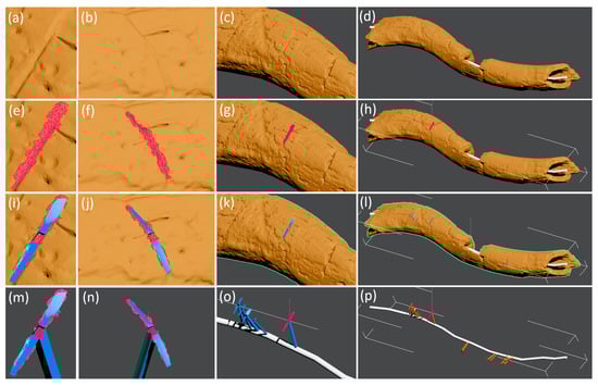 3D design method from different viewpoints of orthographic projection of the centers of the traces on a central spline of the bone: cut location (a–d), manual selection of polygons on the cut (e–h), design of a flattened blue mark corresponding to this selection (i–l) and the projection on the spline (m–p).
