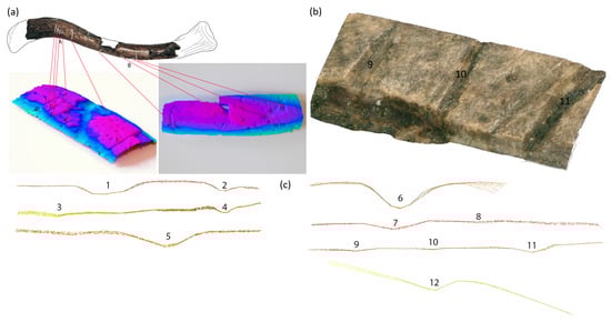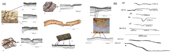 In order to compare the cuts between them, we tried to produce a global view with images from the digital microscope (Figure 12). This shows textured sections associated with cross-sectional views of the contour lines of sections (a). One-line cross sections are also shown (b). The labels consist of the group letter (A or B) and the number of the cut mark. To produce this figure, we used only the sections obtained from the photogrammetries made with the digital microscope images. The references of the cuts are used several times to associate the images with each other. We were not able to clearly represent the cuts B12 to B17 because the images used for photogrammetry did not allow the creation of precise meshes. From this global view reflecting intentional repeated movements, these cuts are likely to be the evidence of human post-mortem interaction. The tool used had to be very sharp and thin, such as a coarse lithic flake or a chisel.