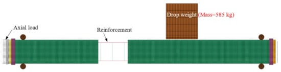 In this study, the non-linear finite element program LS-DYNA was used to model the axially loaded RC column for impact load. Using the available information from the experiment, a finite model was developed, as shown in Figure 3. The center of the impact is 1000 mm away from the right support of the assembly, which simulates the car impact point on the column. The concrete, projectile, roller supports, end plates, and elastomeric pad were modeled as 8-node solid elements. From the mesh sensitivity analysis, it was found that the displacement-time history converged at an element size of 20 and less. Therefore, the element of 15 mm in size was used for concrete in the FE model. The reinforcements were modeled as beam elements, following previous studies [26,32]. For the modeling of the AFRP-retrofitted column, the AFRP sheet was modeled using 4-node thin shell elements with bending and membrane capabilities. The maximum size of the shell element was 15 mm.