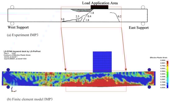 The damage pattern in the FE model of axially loaded RC columns under impact load is shown in Figure 4. For comparison reasons, the test damage pattern of the standard column (Imp3) is given in Figure 4a. It can be seen that the developed FE model can capture concrete damage with reasonable accuracy.