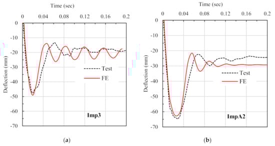 Figure 5 shows the deflection history at the impact point of the columns along with test deflection-time history. Standard column Imp3 was impacted with a velocity of 7.67 m/s, and RFP-retrofitted column ImpA2 was impacted with an impact velocity of 9.40 m/s. It can be seen from the figure that the maximum deflections from FE analysis are almost the same as the test results. The difference between the test and FE maximum deflections is less than 2%. Moreover, the shape of the deflection-time history of the FE model is the same as the test deflection shape. Therefore, it can be inferred that the developed FE model is capable of capturing the impact behavior of RC columns under axial load.
