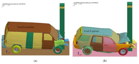 Two SUV types of car models were used in this study. Two Ford van vehicles, namely Econoline and Explorer, were incorporated into the model to simulate an accident of a vehicle crashing into a reinforced concrete column. The models were developed by the National Crash Analysis Center (NCAC) at George Washington University and have been used in support of several NHTSA programs [31]. The geometry of the vehicle’s models is brought into finite element form by digitizing all the vehicles’ parts. The vehicles’ parts are represented using shell, solid, and beam elements. The connectivity between the parts is properly selected to allow the vehicle to move and act in a realistic manner [40]. The overall weight of the Econoline and Explorer vehicles in the finite element models is 2131 and 2254 kg, respectively. Table 2 shows the main features of the finite element model of the vehicles. The selection of the vehicle model was not random since it is based on the size and weight of the vehicle, taking into account that the proposed protection system for columns is dedicated for car parking where only passenger vehicles are permitted. Therefore, a Ford van (Econoline-2007) and the Ford Explorer were selected because their weight is higher than most normal passenger vehicles. The altitude of the frontal part of the selected cars is also considerably high, which means that most of the other brands and categories of passenger vehicles can crash the protection barrier at points lower than the point reached by the Ford SUV vehicles. Figure 6 shows the finite element models of the vehicles and columns that are adopted in this study. Furthermore, the model was tested for stability in crash testing up to a speed of 65 km/h by the developer, indicating that the developed car model can be used for crashworthiness simulations at speeds equal to or lower than the tested speed of 65 km/h.