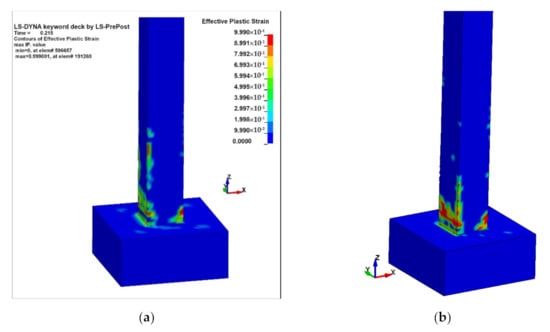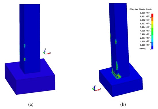 It is worth mentioning that the impact angle of the car may have an effect on the performance of the RC column. It is found in the literature [42] that the column is more vulnerable when the car impacts perpendicular to the column face. However, a car impacting at the column’s corners shows more damage than a car impacting on the column’s sides.