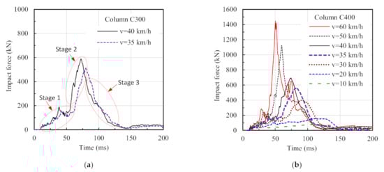 In FE analysis, it was found that up to a car-crashing velocity of 20 km/h, the soft frontal part of the car is damaged and the hard part of the engine box does not come into contact with the column. For this reason, the generated impact force remains below 160 kN. When the crashing speed is increased to 30 km/h and above, the hard part of the engine box comes into contact with the column. As a result, the generated impact force becomes higher than 400 kN, as can be seen in Figure 11b.