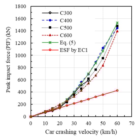 Figure 12 shows the relationship between peak impact forces (PIFs) and the car-crashing velocity. Rates of PIFs increase linearly until the impact speed reaches 20 km/h. At this crashing speed limit, the car experiences deformation in the soft frontal part (distance between the car engine and bumper). In addition, the spring stiffness in this area of the car is nearly constant. As a result, up to a collision speed of 20 km/h, the correlations between PIFs and vehicle speed are almost linear. In contrast, PIF values are increasing in power at twice the speed when the car-crashing speed is from 30 to 60 km/h. Over this impact speed range, the car engine, which is a rather rigid portion of the passenger car, collides with the column. As a result, when the collision speed exceeds 30 km/h, there is a significant increase in impact force. For comparison reasons, in addition to C300 and C400, two more column sizes (C500 and C600) were studied. The size of the cross-section of the column affects the PIF value, as illustrated in Figure 12. Up to a car crushing velocity of 30 km/h, the difference in PIF curves for different column sizes is negligible. Meanwhile, as the column size was reduced, the PIF values increased slightly at car-crashing speeds ranging from 30 to 60 km/h. For example, at a car-crashing velocity of 40 km/h, column C400 produced higher PIFs than C500 and C600. This is due to the fact that reducing the column size reduces the contact area of the crashing point, which results in the deeper penetration of the column inside the vehicle’s frontal part. It should be noted that the impact force increases as the penetration depth increases. This pattern indicates that the stiffness of a vehicle is not constant all over the length of the frontal part. Based on the FE results, the equation of PIFs (in kN) for different car impact velocities is derived as follows,