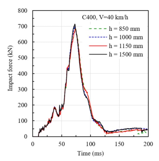 The effect of the impact height on the behavior of RC column was also studied, and it was found that the variation in impact force histories was very little. The peak impact forces were in between 695 to 713 kN for impact heights between 850 and 1300 mm. The impact force-time histories are given in Figure 13. As many studies have shown that the design ESF can be calculated from the impact force-time history [26], the calculated ESF will be almost the same for a crashing height up to 1300 mm. As the column is more rigid than the car, the effect of impact height (between 850 and 1300 mm) on the impact force is very low. However, if the impact location is at the middle of the column, the column will absorb some impact energy by flexural deformation. Therefore, the ESF value will be slightly lower than the ESF value obtained from the impact at the lower part of the column.