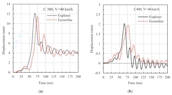 Lateral displacement time histories at 1740 mm height of the columns during the car crash with a velocity of 40 km/h: (a) column size 300 × 300 mm; (b) Column size 400 × 400 mm.