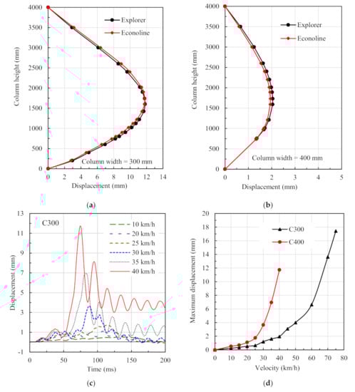 Deformation profile of column at maximum impact force (V = 40 km/h): (a) column size 300 × 300 mm; (b) column size 400 × 400 mm; (c) variation in column displacement history with car impact velocity; (d) effect of car (Econoline) impact velocity on the maximum displacement of column.