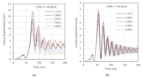 Effect of reinforcement ratio on the lateral displacement at 1740 m height: (a) column size 300 × 300 mm and impact velocity of 40 km/h; (b) column size 400 × 400 mm and impact velocity of 60 km/h.