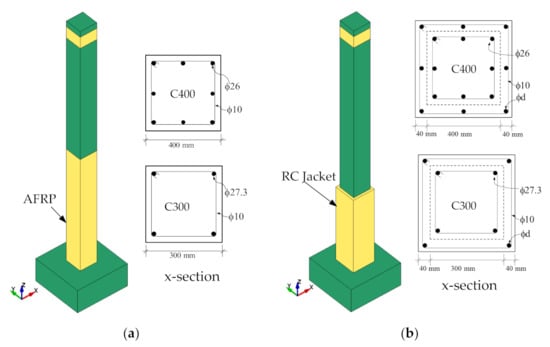 It can be seen that the slender column (C300) experiences permanent residual lateral deformation due to car impacts with an impact velocity of more than 25 km/h. Colum C400 experiences permanent deformation if the car impact velocity is more than 40 km/h. Therefore, it is necessary to provide measures to protect the column from being permanent deformation due to car impacts up to 40 to 50 km/h. There are several methods to reduce the damage in the column against car impacts with an impact velocity of 50 km/h. In this study, the column strength was increased by (1) retrofitting the column with AFRP and (2) providing reinforced concrete jackets (RC jackets) near the column base, as shown in Figure 17.