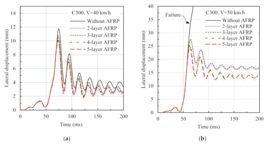 The displacement-time history of the AFRP retrofitted column is shown in Figure 18. With the addition of the AFRP layer to the column, the impact performance of the column is improved. At a car impact velocity of 40 km/h and 2 layers of AFRP sheets, the maximum and residual displacements at the height of 1740 mm are reduced by 12% and 15%, respectively (Figure 18a). Again, at a car impact velocity of 50 km/h, column C300 fails, as indicated in Figure 18b. The failure can be prevented by jacketing the column with two or more layers of AFRP sheets. However, the existence of a large residual displacement (13.5 to 16.5 mm) demonstrates the internal damage of the column. This indicates that the AFRP sheet can reduce the damage of the column but cannot completely eliminate the residual damage for a slender column at moderate car impact velocity. Furthermore, the addition of more than two layers of AFRP does not show any significant improvement in the impact performance of the column, as can be seen in Figure 18. A similar conclusion was drawn by another study, where it was shown that the increasing FRP layers did not improve blast performance significantly [39].