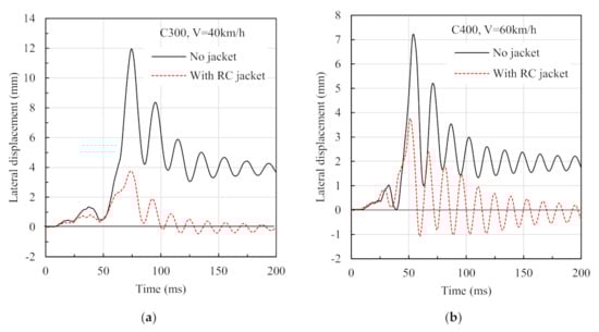 Displacement history of columns with an RC jacket with ϕ10@150 mm shear reinforcement up to 1.3 m height of the column: (a) column size 300 × 300 mm and impact velocity of 40 km/h; (b) column size 400 × 400 mm and impact velocity of 60 km/h.